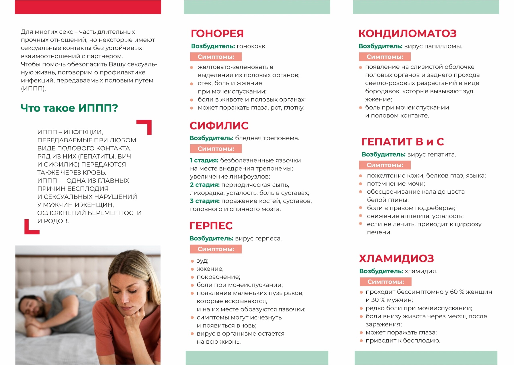 Известно, что половым путем при любом виде незащищенного секса могут передаваться более 30 инфекций. Некоторые ИППП могут также передаваться от матери ребенку во время беременности, родов и кормления грудью. Чаще всего обнаруживают четыре инфекции — сифилис, гонорея, хламидиоз и трихомониаз. Согласно оценкам Всемирной организации здравоохранения (ВОЗ), ежегодно более 357 миллионов людей в возрасте 15-49 лет заболевают этими четырьмя инфекциями. Эти инфекции в настоящее время излечимы. Но от ВИЧ, гепатитов В и С, вируса папилломы человека и простого герпеса в настоящее время нельзя избавиться раз и навсегда.